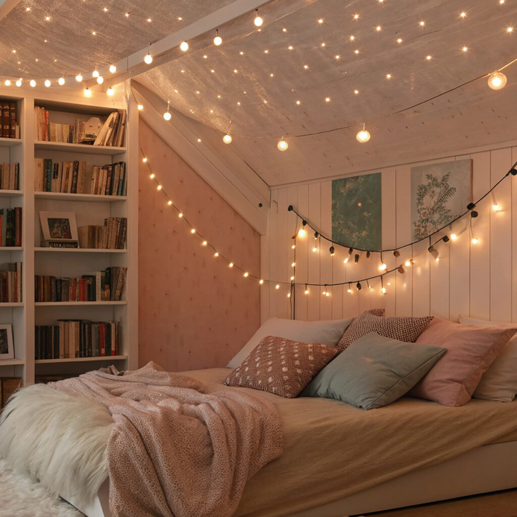 Dans une chambre ou un coin lecture, une simple guirlande lumineuse transforme immédiatement l’ambiance. Placée directement le long des poutres, elle diffuse une lumière douce qui souligne la structure du plafond sans alourdir la décoration. Ce type de luminaire pour poutre apparente fonctionne particulièrement bien dans les pièces dédiées au repos, où l’on recherche une atmosphère calme et enveloppante. Pourquoi ? Parce que ces petites sources lumineuses créent un éclairage discret qui accompagne le bois plutôt que de le masquer. Pour un résultat harmonieux, privilégiez une lumière chaude et évitez de trop charger les poutres. L’objectif est simplement de révéler leur présence tout en conservant une ambiance relaxante.